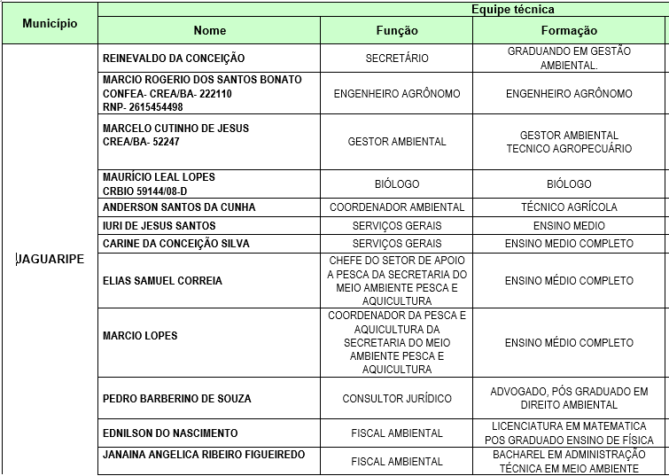 O MUNICÍPIO DE JAGUARIPE, ALÉM DA ESTRUTURA TÉCNICA PRÓPRIA ACIMA, FAZ PARTE DO CONSÓRCIO INTERMUNICIPAL BACIA DO JAGUARIPE, COM CONVÊNIO FIRMADO COM A SECRETARIA ESTADUAL DE MEIO AMBIENTE PARA A GESTÃO AMBIENTAL COMPARTILHADA - GAC.